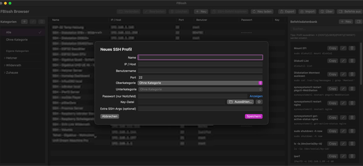FBIssh ist ein macOS-Tool für alle, die regelmäßig per SSH arbeiten: Profile, Key-Dateien, Kategorien und eine praktische Befehlsdatenbank – alles lokal gespeichert.
